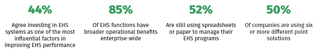 We found that only 5% of EHS functions have achieved the holy grail of consolidating all EHS processes through a single management system, allowing them to reap the benefits of centralizing all EHS data.