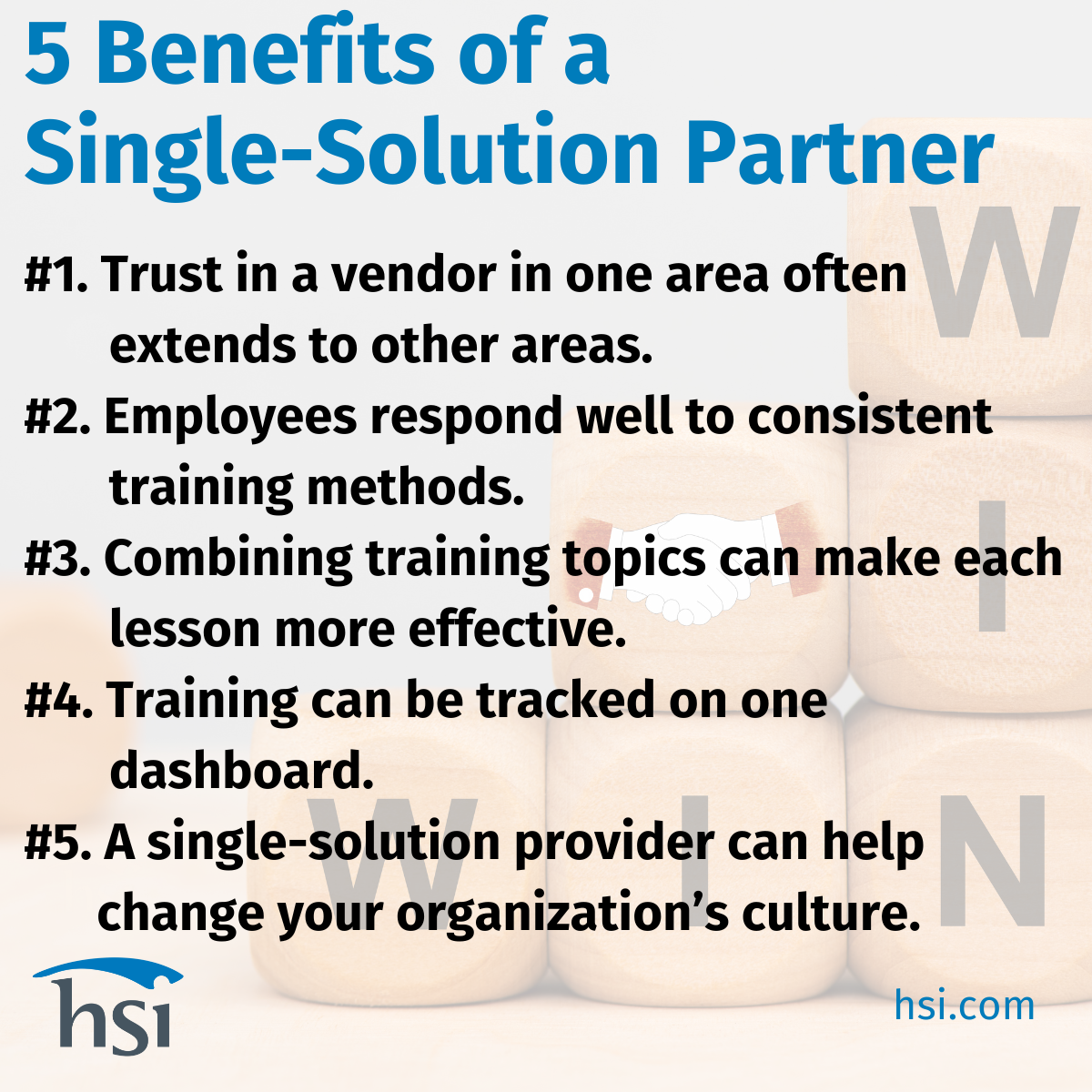 Not only does a single-solution provider reduce potential risks as outlined here, but it offers substantial cost savings to your organization! Furthermore, a robust learning and development training program will increase employee satisfaction ratings and employee retention. According to Gitnux Marketdata Report 2024, the lack of development opportunities and not learning new skills was a top reason why employees left their companies. Enhance the employee experience with a single-solution provider, such as HSI. See what a difference our training makes to your bottom line!