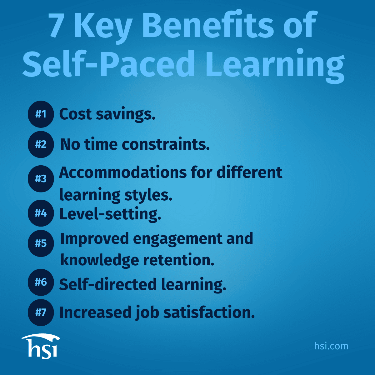 Allowing a blended learning experience is critical in today's multifaceted workplace. This includes online, self-paced, and self-directed learning from providers like HSI. This article reviews the seven key benefits of self-paced learning for employee learning and development as well as organizational success, including:
